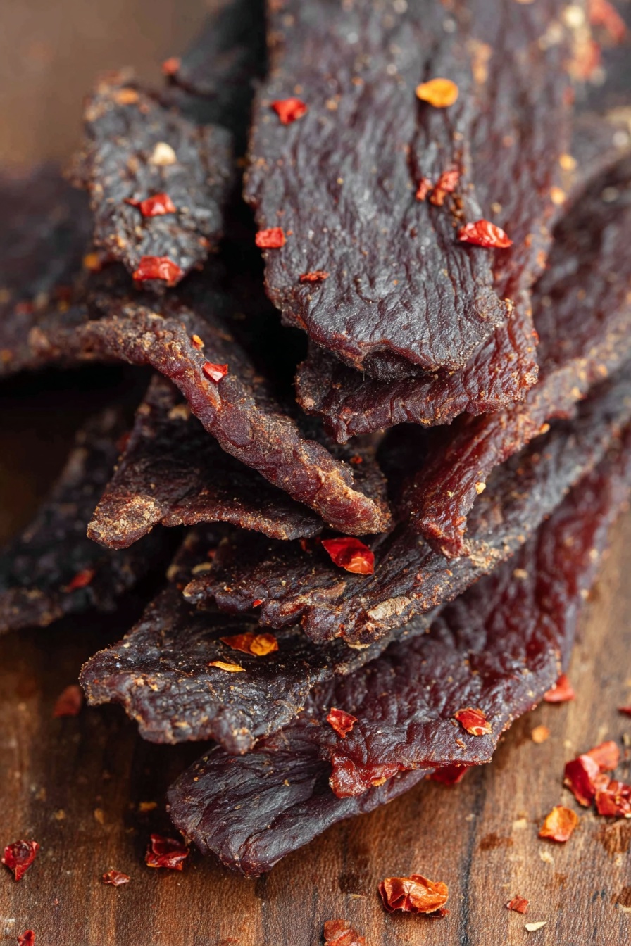 While jerky is generally enjoyed on its own, I like to add a sprinkle of coarse sea salt or a drizzle of hot honey for an extra flavor punch. Sometimes, tossing a little smoked paprika on top right before serving amps up the smoky notes beautifully.