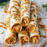- Assemble Taquitos: Spoon about ¼ cup of the chicken mixture onto the bottom third of each tortilla. Roll tightly and place seam-side down on the prepared baking sheet. Repeat with all tortillas and filling. (Optional: flash freeze before baking for storage.)