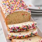 - Transfer batter to loaf pan: Pour the batter into the prepared loaf pan and spread the top evenly. Sprinkle the 3 tablespoons of rainbow colored jimmie sprinkles evenly over the surface.
