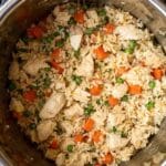 - Prepare Chicken: Remove the cooked chicken breasts to a cutting board and let rest for a few minutes. Chop the chicken into bite-sized pieces. Return the chopped chicken to the pot and stir it into the rice mixture. Add the cooked frozen peas and combine.