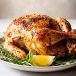 These ingredients work perfectly in harmony — the spices bring warmth and depth, while the lemons and herbs brighten the whole dish. When shopping, look for a fresh, plump chicken and fresh thyme or rosemary for the best results.