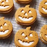 Once assembled, store leftover sandwich cookies in an airtight container in the fridge for up to 4 days. I like to layer them between sheets of parchment paper to keep the frosting from sticking or smudging the pumpkin faces.