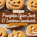 Celebrate Halloween with these festive Jack-O’-Lantern Sandwich Cookies featuring spiced pumpkin-flavored dough and creamy vanilla cream cheese frosting. Perfectly shaped with pumpkin faces, these cookies are as delightful to look at as they are to eat.