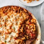 - Assemble the Casserole: Transfer the pasta and meat mixture to the prepared casserole dish, spreading it out evenly. Sprinkle the remaining cheese evenly over the top.
