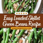 This Loaded Skillet Toasted Green Beans recipe features crisp green beans sautéed with savory bacon and shallots, then topped with crunchy toasted almonds, tangy feta cheese, and flavorful garlic butter breadcrumbs for a deliciously textured side dish perfect for any meal.