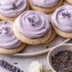 - Frost the Cookies: Once cookies are completely cooled, spread about 1 tablespoon of the lavender cream cheese frosting evenly on each cookie using a mini offset spatula. Serve and enjoy!