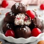 Using a fork, dip each truffle ball completely into the warm chocolate, tap off any extra on the side of the bowl, and place them back on the parchment. Pop the tray back into the fridge to chill until the chocolate hardens. It doesn’t take long, and soon you’ll have shiny, irresistible cherry coconut truffles ready for sharing (or sneaking!).