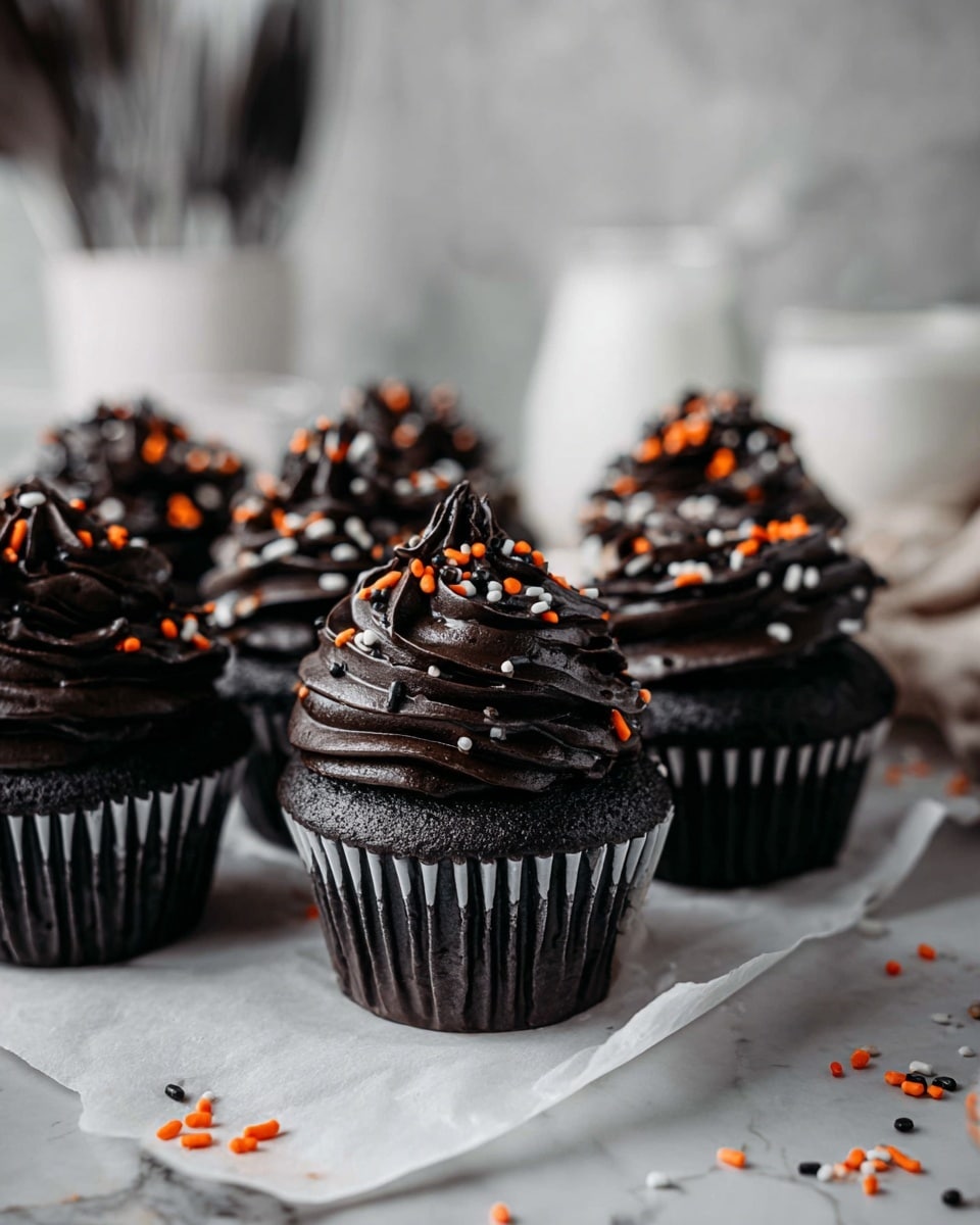 9. Frost the cupcakes: Using a piping bag fitted with a Wilton 1M tip or a spatula, frost the completely cooled cupcakes with the black cocoa frosting.