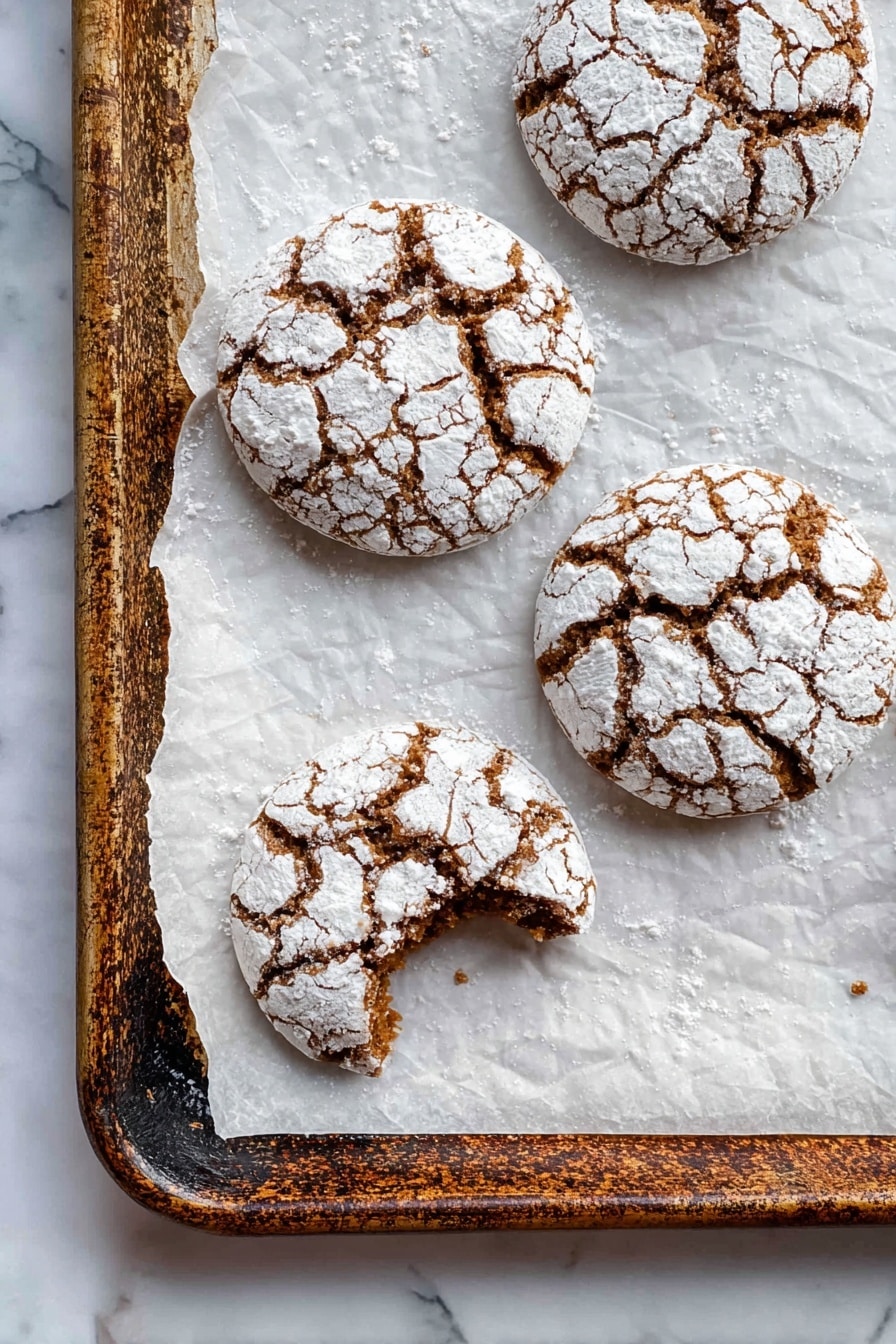 Preheat your oven to 375°F (190°C). Line two baking sheets with parchment paper. Roll each chilled dough ball first in granulated sugar, then in powdered sugar—this double coating creates that signature crinkle top. Arrange 6 to 8 dough balls on each sheet, giving them space to spread a little. Bake for 11-13 minutes until you see edges turning a light golden brown and beautiful crackles forming on the top. Remember, don’t over-bake! The centers should remain soft and chewy when cooled.