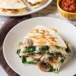 This Mushroom and Spinach Quesadillas recipe combines tender sautéed portobello mushrooms and fresh spinach with melted Mexican and Muenster cheeses, all sandwiched between crispy flour tortillas. A quick and savory meal perfect for lunch or dinner, offering a delightful blend of earthy veggies and gooey cheese.