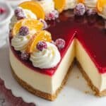 This No Bake Cranberry Orange Cheesecake is a luscious and creamy dessert that combines tangy orange flavors with a rich cream cheese filling atop a buttery graham cracker crust. It features a smooth, no-bake orange-infused cheesecake base, a homemade cranberry topping that is cooked and pureed for a velvety texture, and sparkling candied cranberries for elegant decoration. Finished with piped whipped cream swirls and fresh orange slices, this cheesecake is perfect for festive occasions or any time you want a stunning and refreshing dessert without turning on the oven.