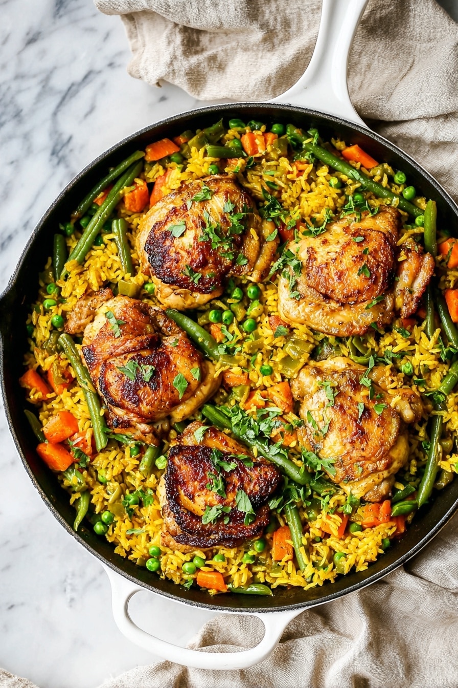 This One Pan Thai-Inspired Coconut Yellow Curry Chicken & Rice recipe is a vibrant, flavorful, and easy-to-make meal combining tender chicken thighs with fragrant yellow curry, fresh vegetables, and creamy coconut milk. Cooked entirely in one skillet, this dish offers a perfect blend of Thai flavors with the convenience of minimal cleanup, ideal for a weeknight dinner or meal prep.