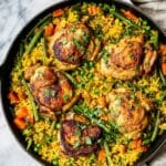 This One Pan Thai-Inspired Coconut Yellow Curry Chicken & Rice recipe is a vibrant, flavorful, and easy-to-make meal combining tender chicken thighs with fragrant yellow curry, fresh vegetables, and creamy coconut milk. Cooked entirely in one skillet, this dish offers a perfect blend of Thai flavors with the convenience of minimal cleanup, ideal for a weeknight dinner or meal prep.
