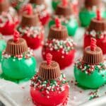 - Decorate: Immediately top each dipped truffle with an upside-down miniature Reese’s Cup and sprinkle Christmas sprinkles over the chocolate.