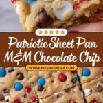 These Patriotic Sheet Pan Red White & Blue M&M’s Chocolate Chip Cookies are a festive twist on classic cookie bars, featuring a buttery dough studded with semi-sweet chocolate chips and vibrant red, white, and blue M&Ms. Baked in a sheet pan for easy preparation and sharing, they’re perfect for celebrations like Independence Day or any casual get-together. The cookie bars are soft in the center with golden edges and bursting with sweet, colorful candy pieces.