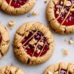 These Peanut Butter and Jelly Cookies combine the classic flavors of creamy peanut butter and sweet strawberry jam into a delightful baked treat. Featuring a soft and chewy texture with a jammy center and an optional peanut butter drizzle, these cookies are perfect for any occasion and easy to prepare.
