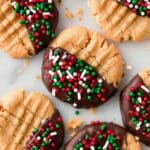 These Peanut Butter Christmas Cookies are a festive and delicious treat featuring a soft and chewy peanut butter base dipped in smooth semi-sweet chocolate and adorned with colorful holiday sprinkles. Perfect for holiday gatherings, these cookies combine classic flavors with a fun seasonal twist.