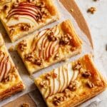 This Pear, Walnut & Cheddar Puff Pastry Tart is a delightful combination of spicy cheddar cheese, sweet ripe pears, and crunchy toasted walnuts on a flaky puff pastry crust. It’s perfect as a sophisticated appetizer or a light dessert, balancing sweet and savory flavors with a touch of honey and a sprinkle of sea salt.