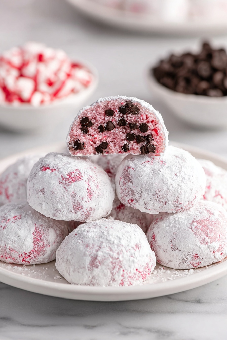 Delight in these festive Peppermint Snowball Cookies, featuring a buttery, tender texture infused with peppermint and vanilla, studded with mini chocolate chips, and coated in crushed peppermint candies and powdered sugar for a perfect holiday treat.