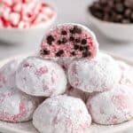 Delight in these festive Peppermint Snowball Cookies, featuring a buttery, tender texture infused with peppermint and vanilla, studded with mini chocolate chips, and coated in crushed peppermint candies and powdered sugar for a perfect holiday treat.