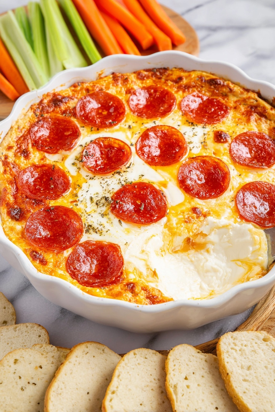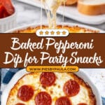 This Pepperoni Dip is a warm, cheesy, and flavorful appetizer perfect for parties and gatherings. It combines a creamy blend of cream cheese and sour cream with Italian seasonings, layered with marinara sauce, mozzarella, parmesan, and topped with savory pepperoni slices. Baked until bubbly and golden, this dip pairs wonderfully with baguette slices, pretzels, or veggies for a crowd-pleasing snack.