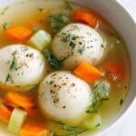 This classic Matzo Ball Soup recipe features fluffy matzo balls made with eggs, schmaltz, and fresh herbs, cooked in a flavorful homemade chicken stock with aromatic vegetables. A comforting traditional Jewish dish perfect for any occasion, offering a rich and savory broth paired with tender matzo dumplings.
