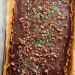 - Spread Chocolate & Add Toppings: Once melted, spread the chocolate to cover the caramel layer completely. If the chips do not melt sufficiently, place the pan back in the oven for 1-2 minutes and then spread. Sprinkle your choice of toppings such as chopped pecans, sprinkles, or flaky sea salt over the chocolate.