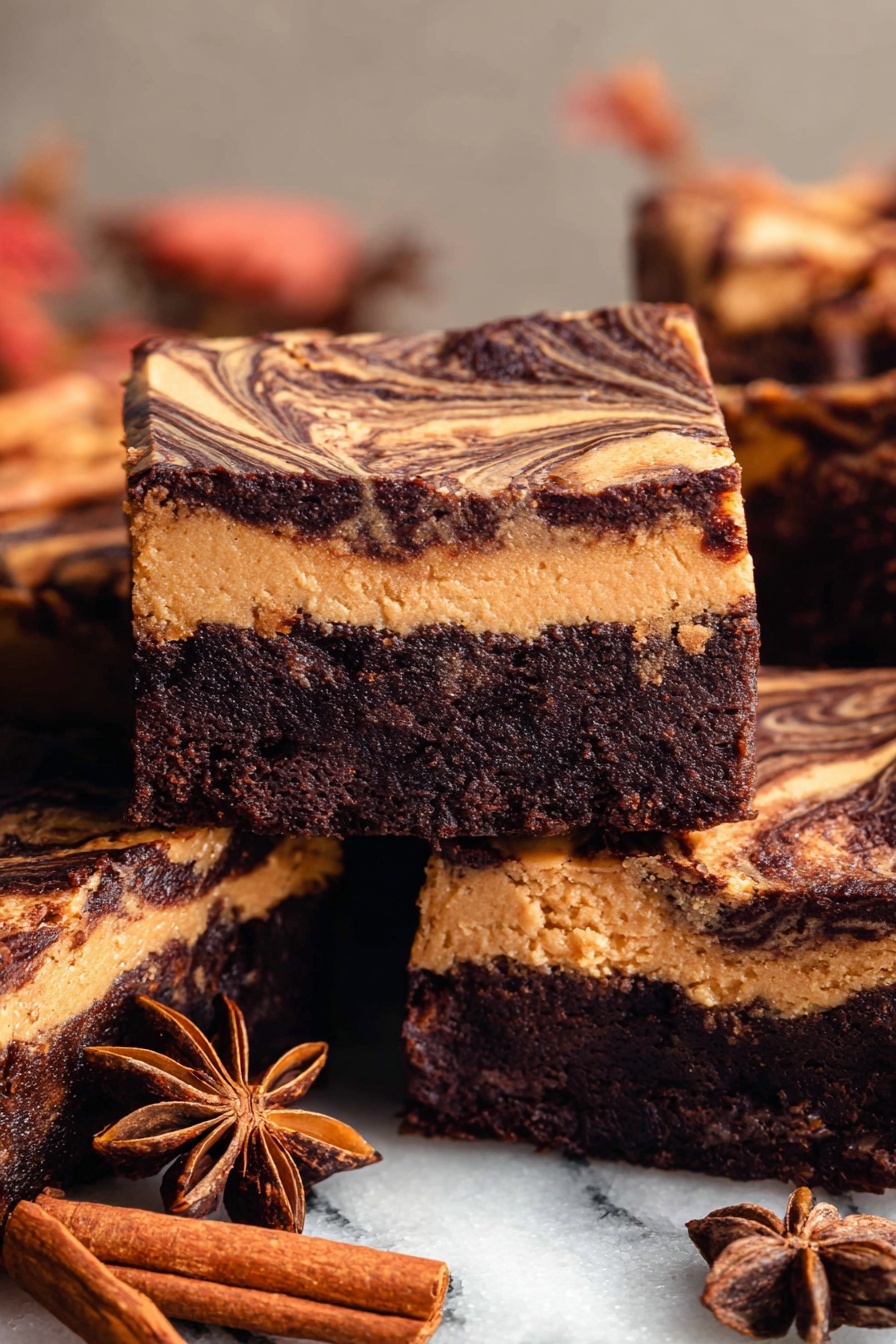 These brownies are pretty decadent on their own but pairing them with a scoop of vanilla bean ice cream or some lightly whipped cinnamon-spiced cream really takes things up a notch. I also enjoy a warm cup of chai or coffee alongside—the spices in the drink echo the pumpkin pie spice perfectly.