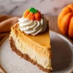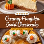 This pumpkin cheesecake recipe combines a creamy, spiced pumpkin batter swirled with classic cheesecake on a buttery graham cracker crust. It’s baked in a water bath to ensure a smooth, silky texture and topped with homemade whipped cream for a festive fall dessert.