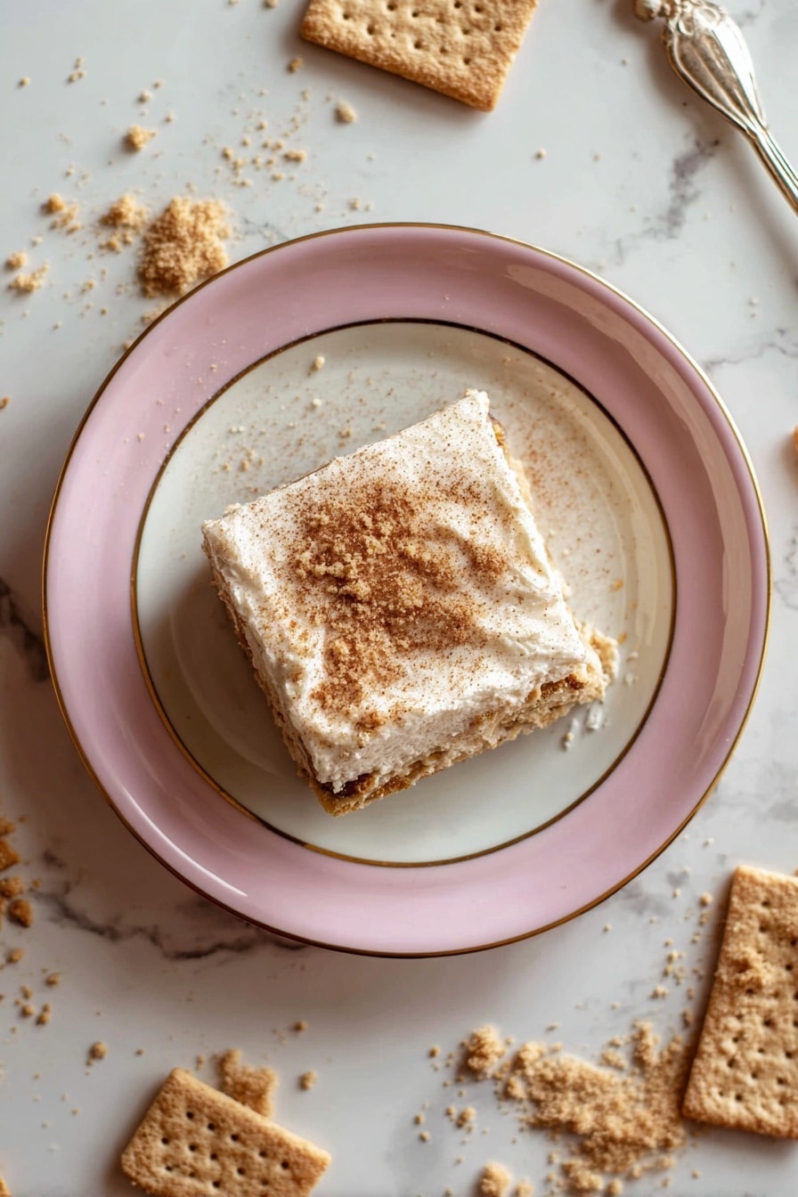 Cover the dish tightly with plastic wrap and pop it in your fridge for at least 8 hours or overnight. This chilling time is where all the layers soften and marry into a creamy, sliceable dessert. If you want those perfect clean slices, I’ve found that freezing the cake for about 30 minutes before cutting helps a lot. Right before serving, sprinkle with fresh crushed graham crackers and a little cinnamon or pumpkin spice for that extra pop of texture and flavor.