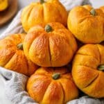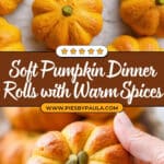 Delightful and festive Pumpkin Dinner Rolls that are soft, fluffy, and infused with warm spices like cardamom and garlic powder. These rolls are perfect for fall dinners or holiday gatherings, featuring a unique pumpkin puree addition and a playful pumpkin-like design with green pumpkin seed ‘stems’. The recipe uses a yeast dough that rises twice for a light texture, baked to golden perfection.