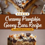 These Pumpkin Gooey Bars combine a buttery graham cracker crust with a creamy pumpkin-infused cream cheese layer, topped with melted dark chocolate chips and toasted coconut for a gooey, rich dessert perfect for the fall season or any time you crave a comforting treat.