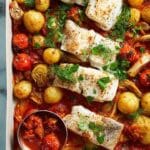 This Puttanesca Fish Tray Bake is a delicious, one-pan Mediterranean-inspired dish featuring tender barramundi fillets baked on a bed of flavorful puttanesca sauce with roasted baby potatoes. It’s an easy, wholesome meal perfect for family dinners or entertaining, combining salty kalamata olives, capers, anchovies, and fresh herbs for a vibrant, savory taste.