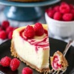 - Assemble Cheesecake: Pour filling over crust. Drop spoonfuls of raspberry sauce onto filling and gently swirl with toothpick or knife.