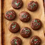 - Dip Cookies: Using two forks, dip each assembled Ritz and Reese cup sandwich into the melted chocolate, allowing excess chocolate to drip off. Scrape off extra chocolate from the bottom to prevent puddles. Transfer dipped cookies onto parchment paper and immediately sprinkle with holiday sprinkles.