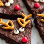 - Add Pretzel Antlers: Spread a small amount of melted chocolate on the bottoms of two pretzel twists, then press them onto the top corners of the brownie slice to create the antlers.