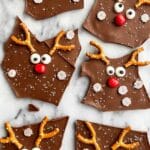 - Decorate with reindeer features: Arrange the pretzel antlers, candy eyeballs, and red M&Ms on the chocolate surface to form reindeer faces. Gently press each piece to help them adhere. Optionally, sprinkle holiday sprinkles over the background for added festive flair.