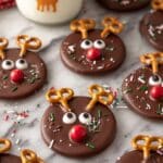- Add Antlers: Place two itty bitty pretzels on top of each chocolate circle positioned like antlers.