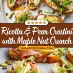If you have any leftovers (though I bet you won’t!), store the crostini components separately. Keep toasted baguette slices airtight to maintain crispness. Ricotta mixture, nut crunch, and sliced pears should be refrigerated but kept apart to prevent sogginess.