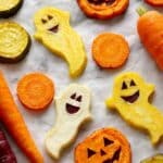 Once the veggies are cooled enough to handle, slice the potatoes and beets into about ½ inch thick slabs. Here’s where you channel your inner kid or artist—use a small paring knife or fun cookie cutters to carve jack-o’-lantern faces into the sweet potatoes and spooky ghost shapes into the white potatoes (I even used a straw to punch out cute little eyes). Cut the beet slabs into witch’s hat shapes, and leave the carrots as is to transform into witch’s fingers. Making it playful really adds to the Halloween spirit, and your guests will love the effort.