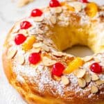 Roscón de Reyes is a traditional Spanish sweet bread enjoyed during the Epiphany season. This aromatic, festive bread is infused with citrus zest, orange blossom water, and a touch of rum, then topped with candied fruits and almonds. It features a soft, slightly tacky dough that rises twice for a fluffy texture and is beautifully adorned before baking to a golden perfection.