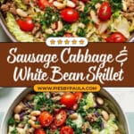 A hearty and flavorful one-pan meal featuring Italian chicken sausage, tender cabbage, cherry tomatoes, and creamy cannellini beans, all cooked together in a skillet for a quick and satisfying dinner.