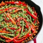 A vibrant and healthy sesame-orange ginger chickpea stir-fry packed with fresh vegetables and a flavorful citrus-ginger sauce. This gluten-free, vegan-friendly dish combines tender chickpeas with crisp green beans, red bell peppers, and a zesty orange sauce, perfect for a quick and nutritious weeknight meal served over quinoa or brown rice.