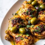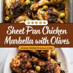 This Sheet Pan Chicken Marbella recipe offers a vibrant fusion of savory, sweet, and briny flavors through a delicious olive paste marinade and a medley of olives, prunes, and capers. Bone-in, skin-on chicken drumsticks and thighs are coated with a flavorful olive paste and baked to juicy perfection on a single sheet pan, making it an easy yet impressive one-pan meal. The pan drippings are transformed into a rich, buttery sauce that complements the tender chicken, perfect for serving family-style.