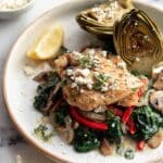 This Sheet Pan Artichoke Chicken with Goat Cheese is a flavorful, easy-to-make one-pan dinner perfect for busy weeknights. Tender boneless skinless chicken thighs are roasted alongside fresh baby artichokes, mushrooms, bell pepper, shallots, and spinach, all tossed in a zesty lemon-garlic thyme marinade. Finished with creamy crumbled goat cheese and a sprinkle of fresh thyme, this dish is both wholesome and elegant, offering a delicious balance of protein and vegetables with bright, savory notes.