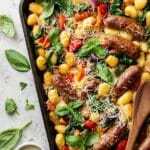This Sheet Pan Gnocchi with Kielbasa and Vegetables is a simple and delicious one-pan meal featuring tender gnocchi, smoky kielbasa, and a colorful medley of vegetables roasted to perfection with fresh herbs and Parmesan cheese. It’s a quick and easy dinner perfect for busy weeknights, offering a comforting blend of flavors and textures with minimal cleanup.