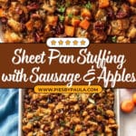 A delicious and easy Sheet Pan Stuffing recipe featuring rustic bread cubes toasted to perfection, sautéed onions, celery, and apples, combined with savory Italian sausage, fresh herbs, dried cranberries, and pecans. Baked on a single pan until crispy on top, this hearty stuffing is perfect for holiday dinners or cozy family meals.