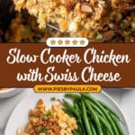 This Slow Cooker Alpine Chicken recipe combines tender boneless skinless chicken breasts with creamy Swiss cheese, savory cream of chicken soup, crunchy almonds, and buttery stuffing. Cooked low and slow in a crockpot, this comforting dish is easy to prepare and perfect for a hearty family meal.