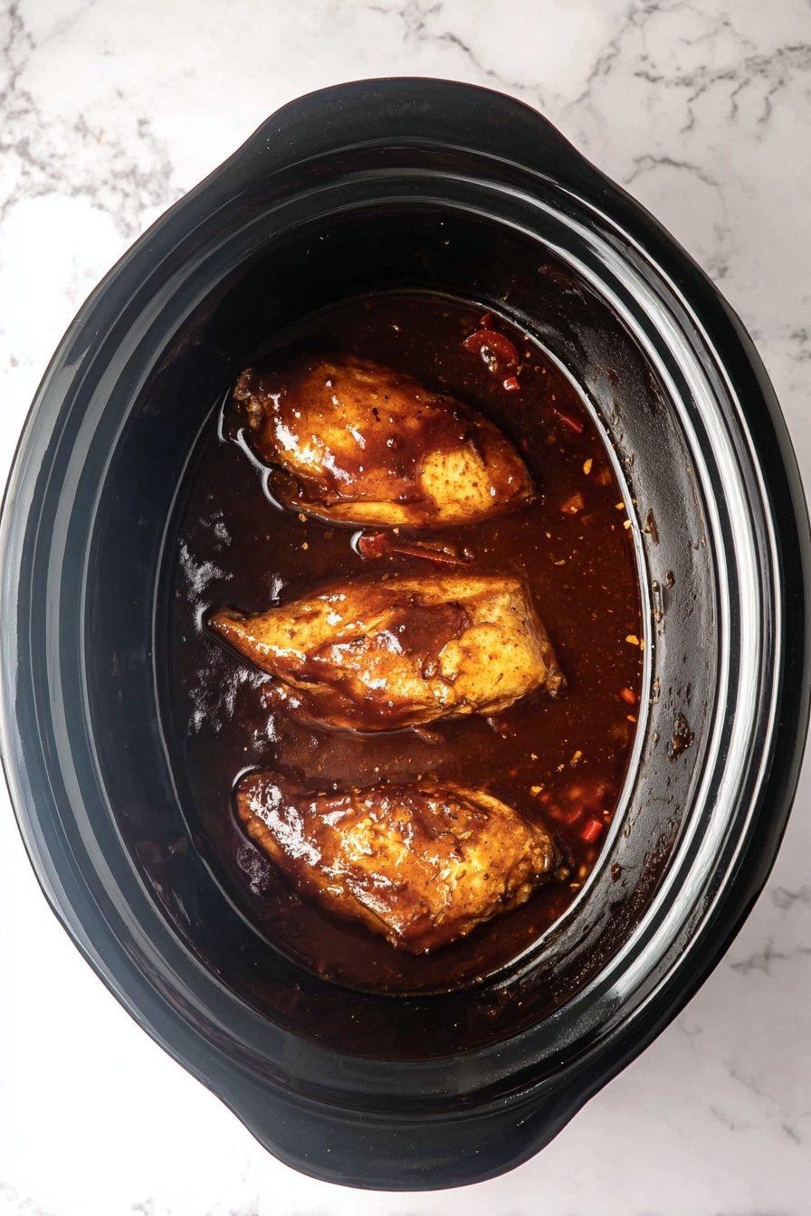 - Add Butter and Chicken: Cut the remaining tablespoon of butter into two pieces and stir into the slow cooker sauce. Nestle the boneless, skinless chicken breasts into the sauce ensuring they’re well coated.