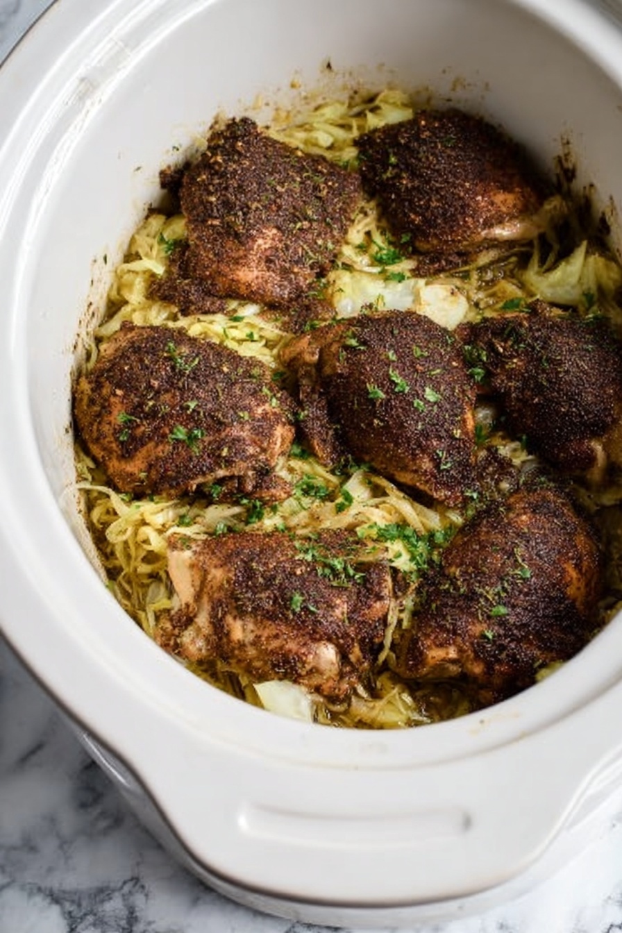 This Slow Cooker Chicken and Cabbage recipe is a comforting and easy-to-make dish featuring tender chicken thighs cooked with buttery cabbage and a blend of savory seasonings. Perfect for a hands-off meal, it delivers hearty flavors with minimal prep and cleanup.